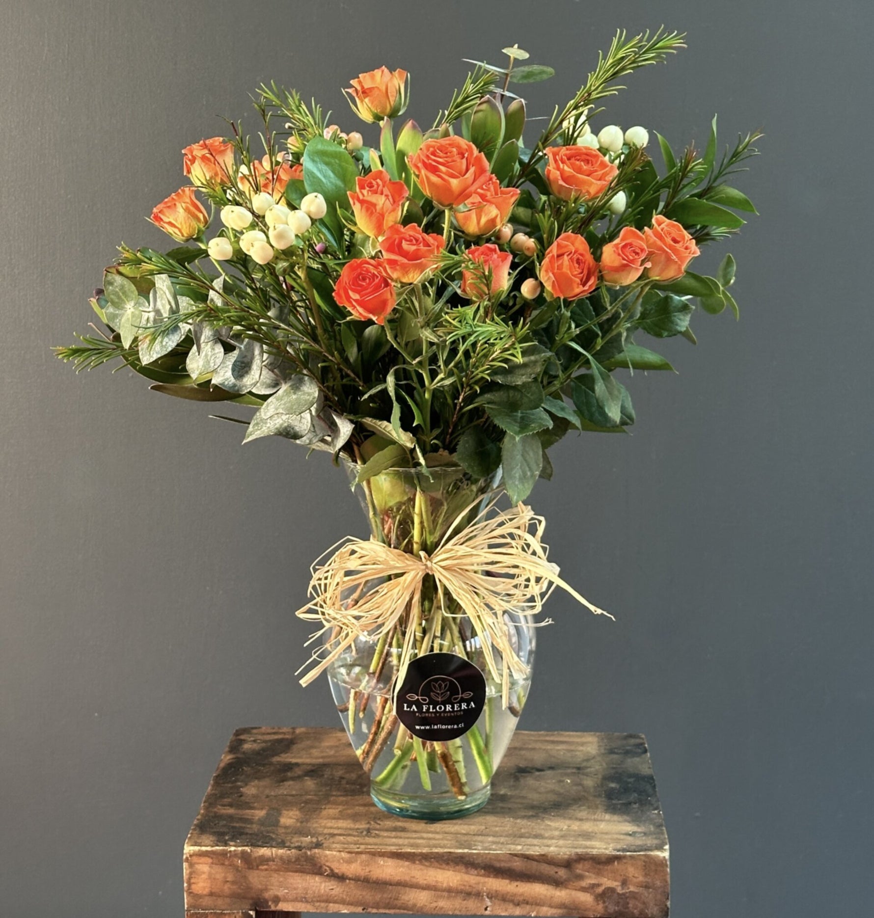 Precio unitario / porFlorero de vidrio con flores naranjas y follajes verdes