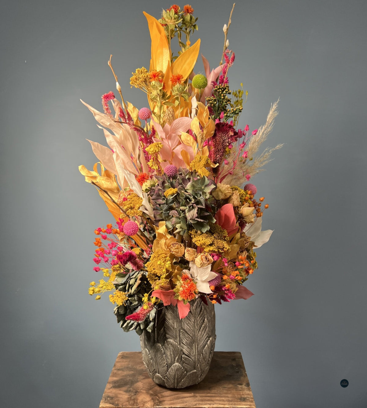 Precio unitario / porArreglo floral en base con flores secas y preservada con tonos coloridos tamaño XL