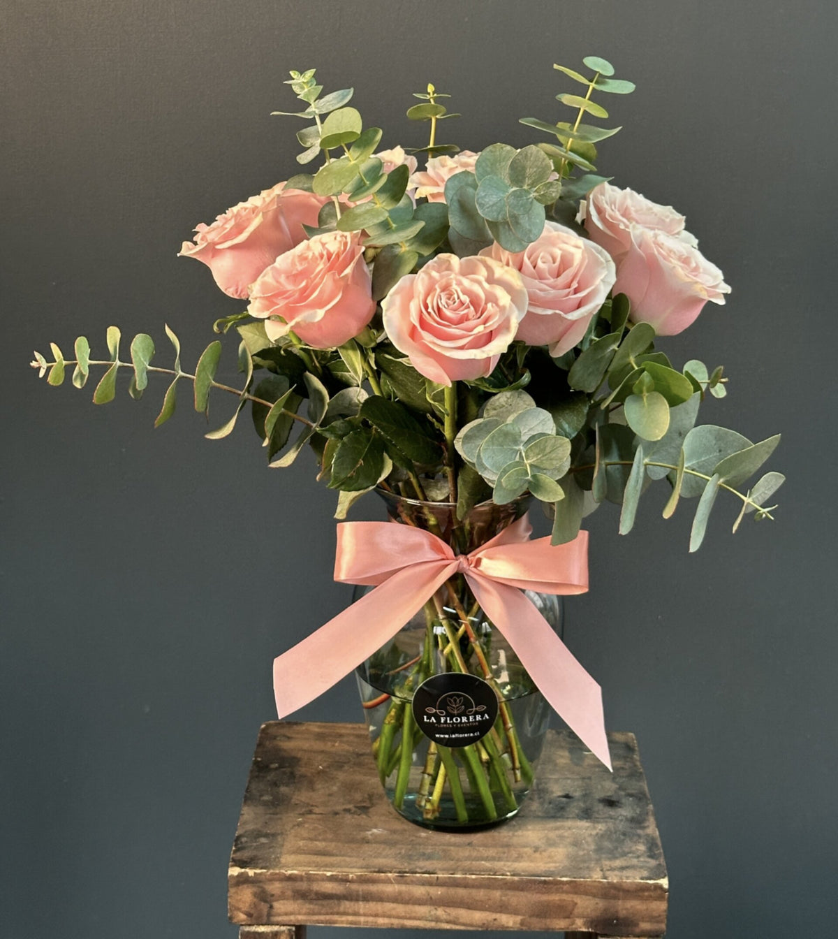 FLORERO 12 ROSAS ROSADAS Y EUCALIPTO