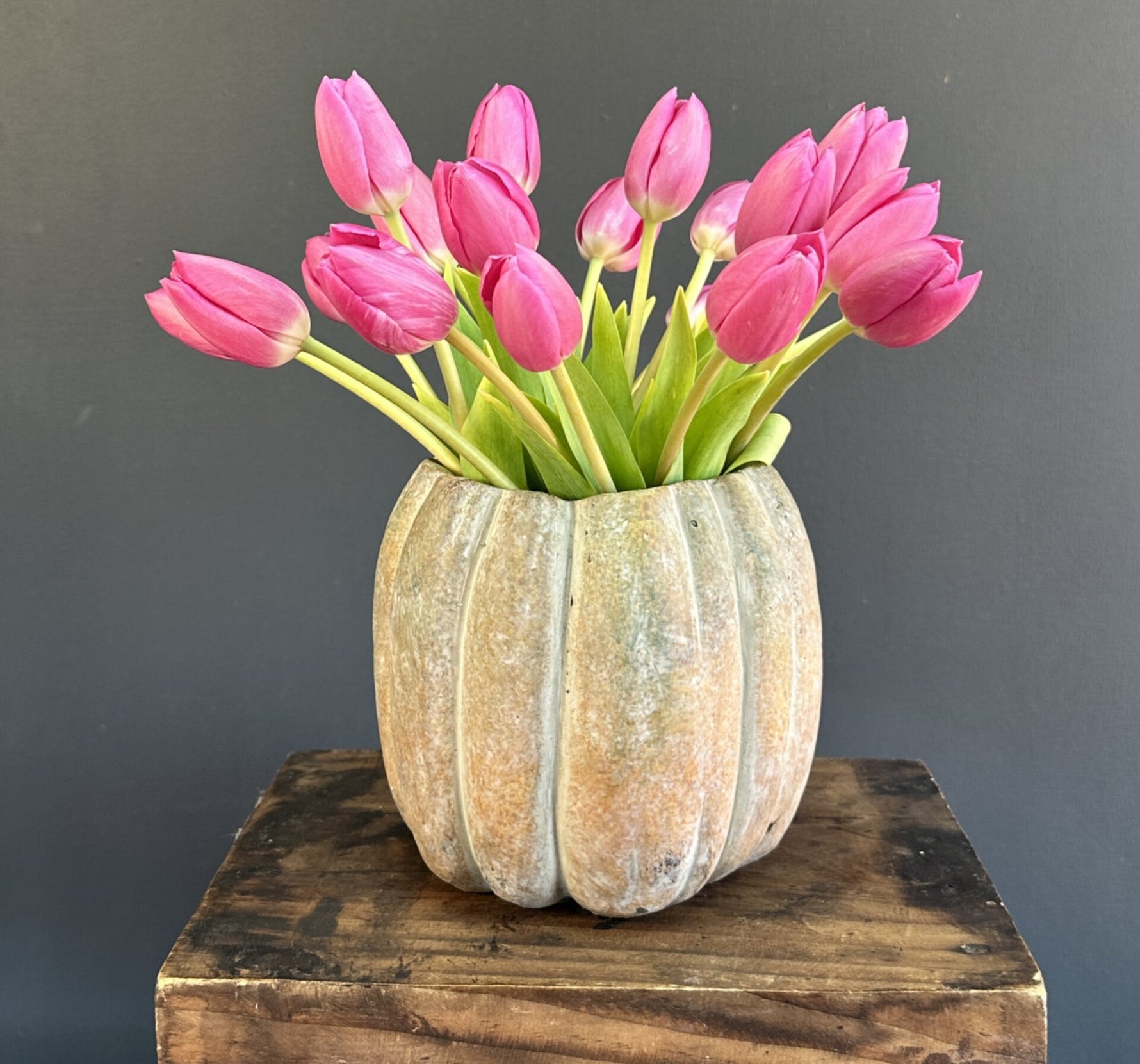 Precio unitario / porFlorero calabaza con 20 tulipanes rosados.