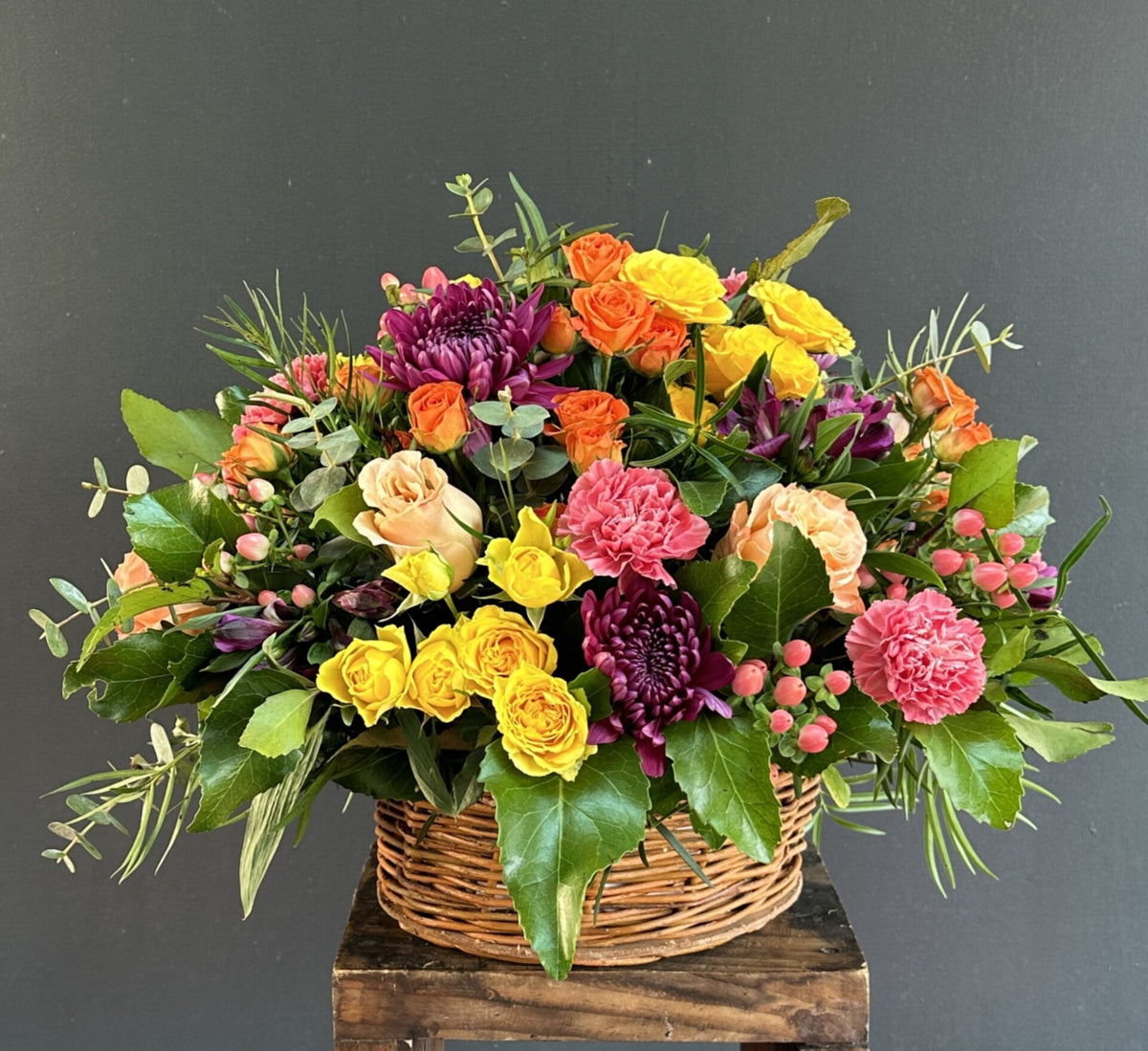 Precio unitario / porCanasto de mimbre con flores mixtas coloridas y follaje verde