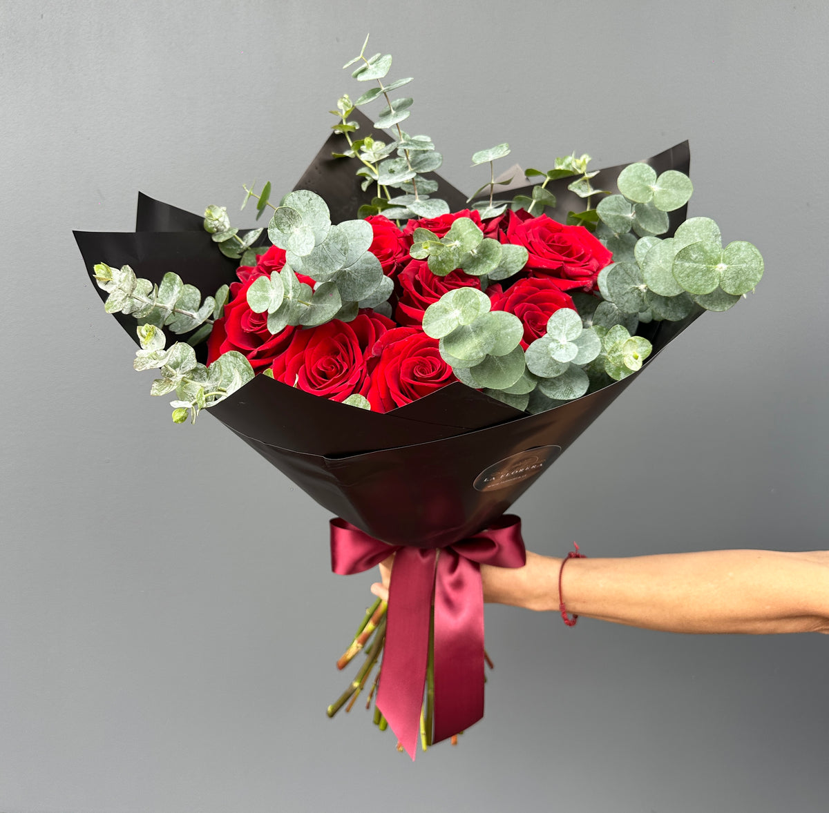 RAMO DE 12 ROSAS ROJAS Y EUCALIPTO