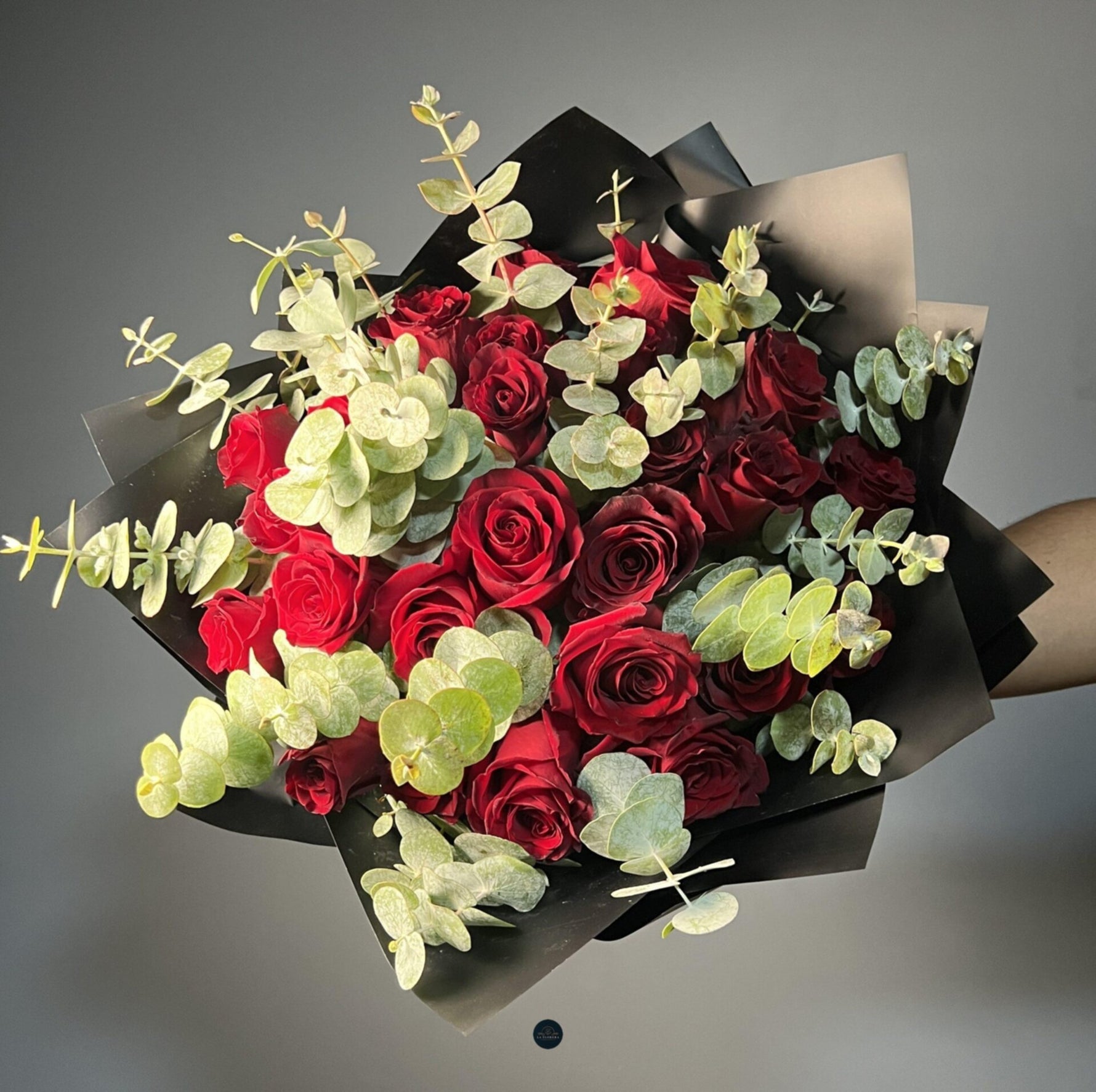 RAMO DE 24 ROSAS ROJAS Y EUCALIPTO
