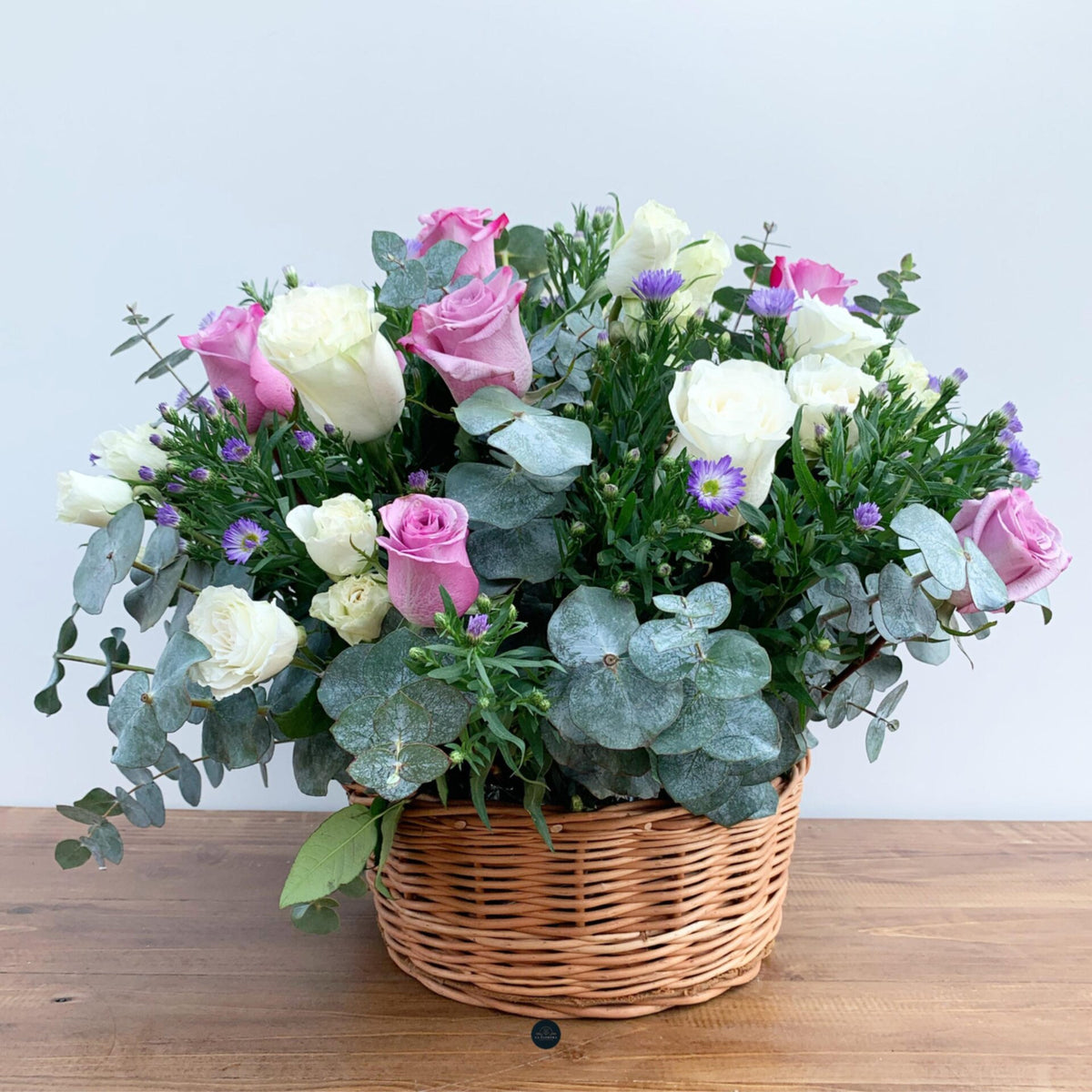 Precio unitario / porCanasto de mimbre con flores lilas y follaje verde
