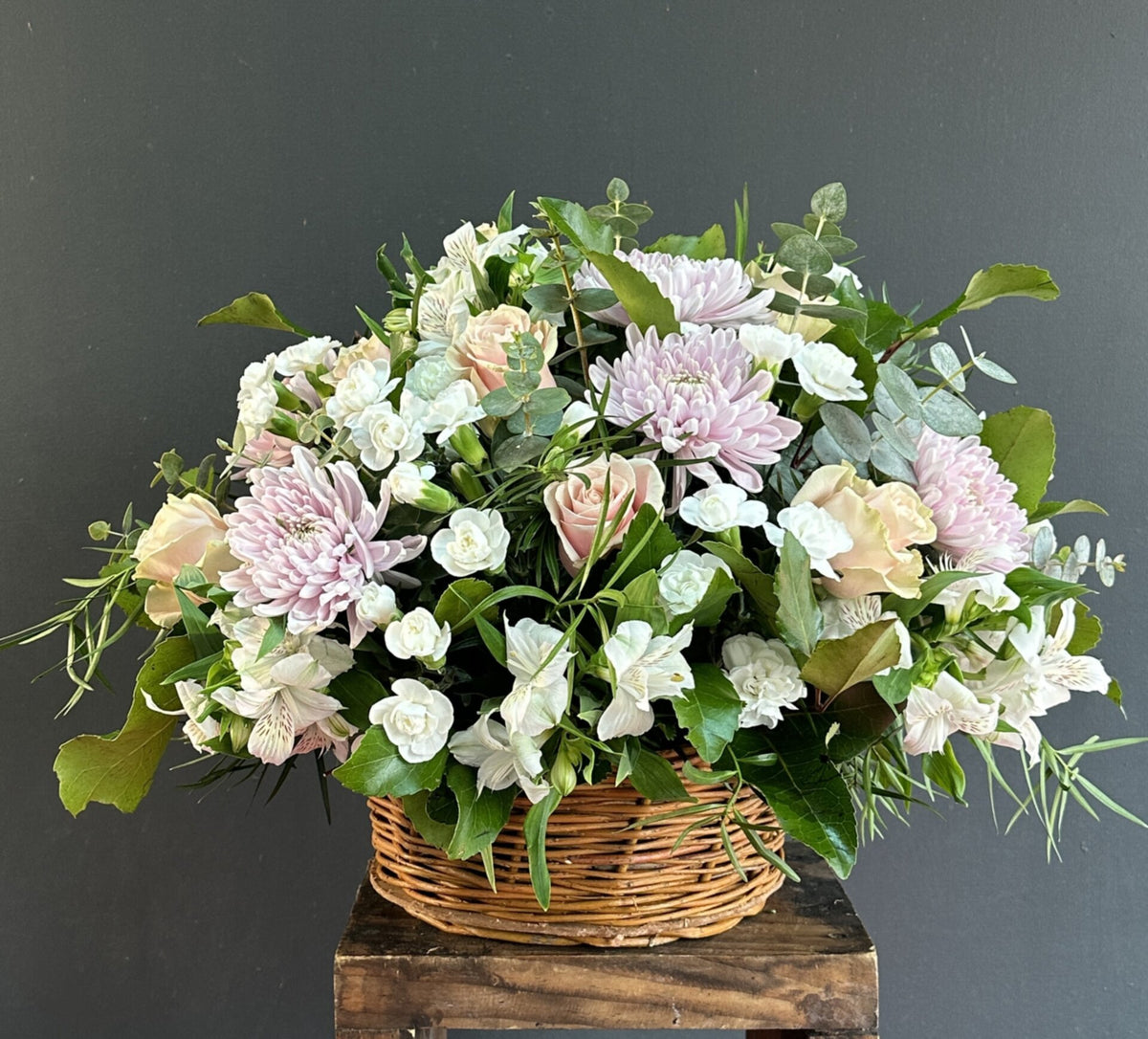 Precio unitario / porCanasto de mimbre con flores rosadas y follaje verde