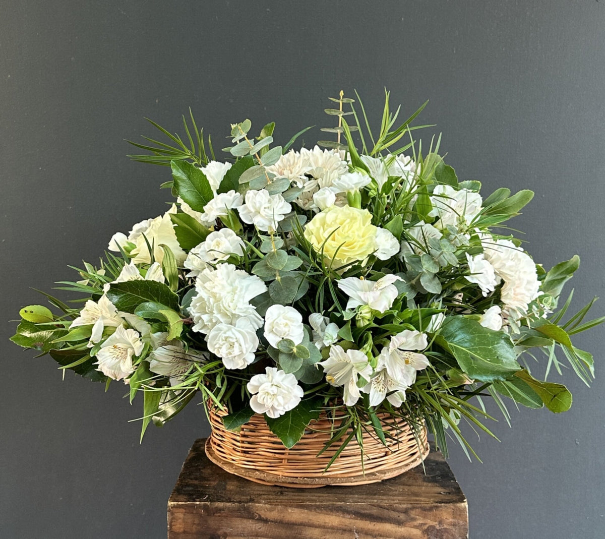 Precio unitario / porCanasto de mimbre con flores blancas y follajes verdes
