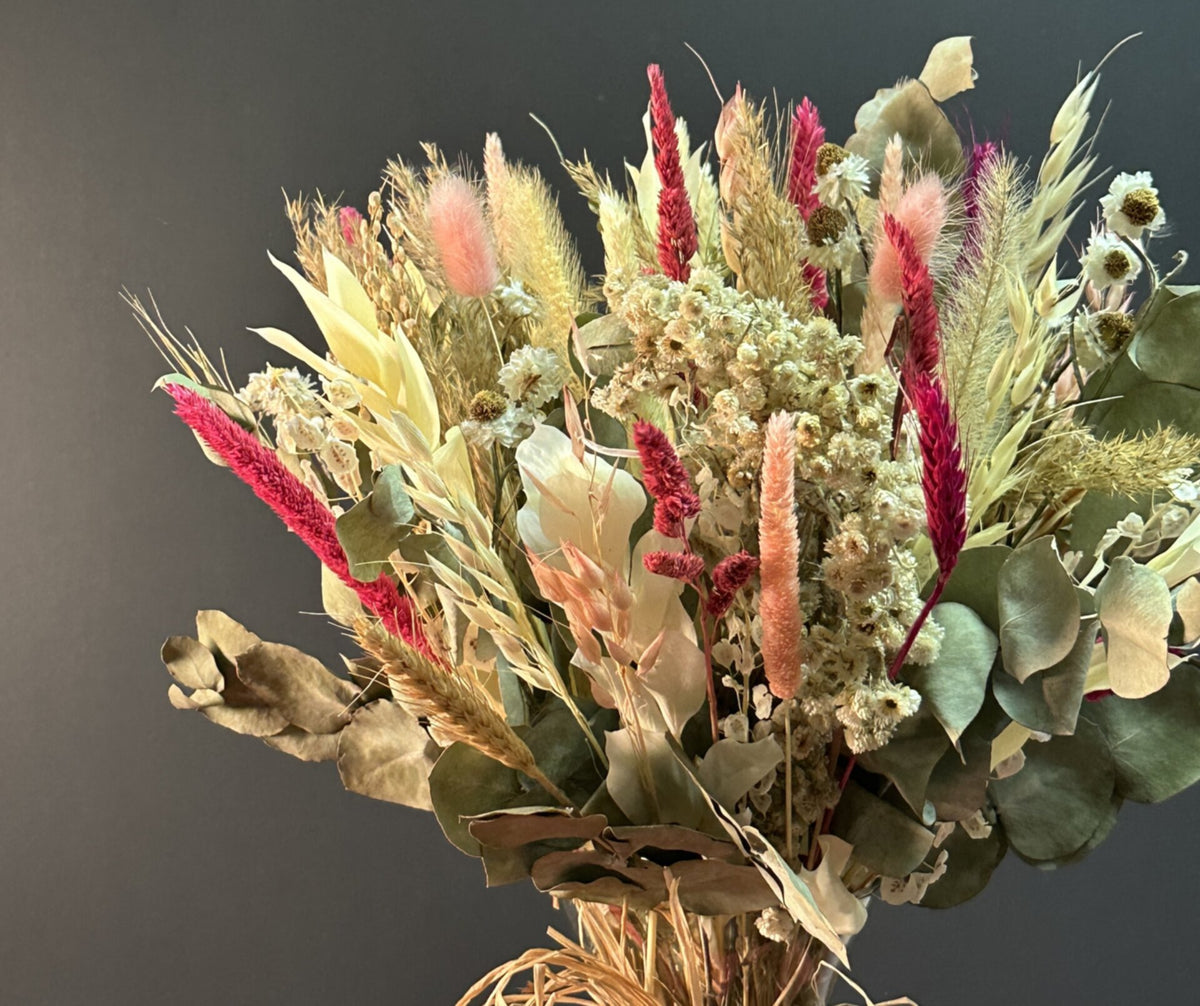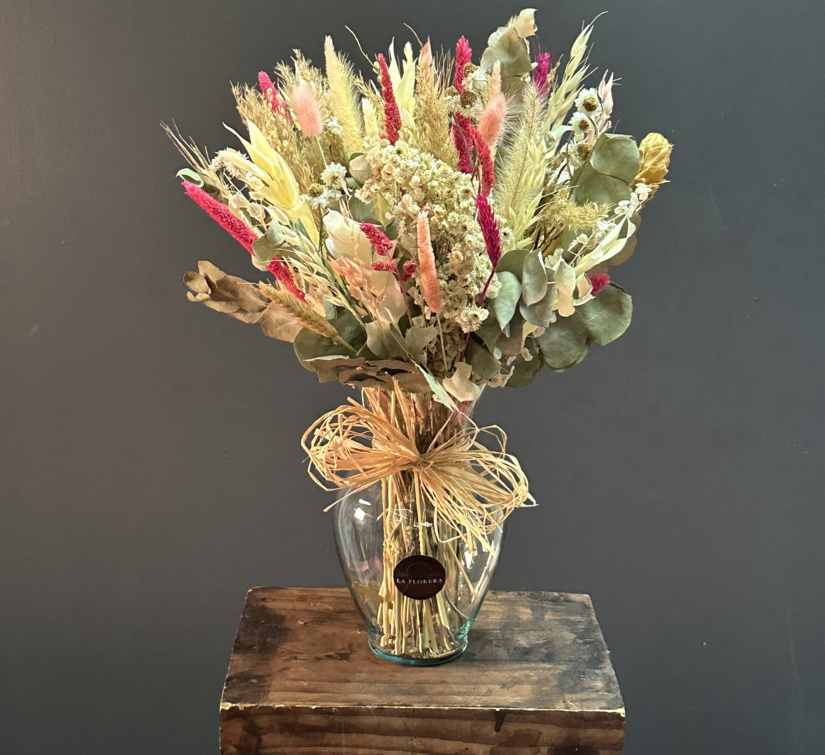 Florero con flores secas y preservada tamaño M tonos blancos y rosados.