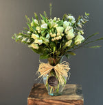 Florero de vidrio con flores mixtas en tonos blancos y follajes verdes