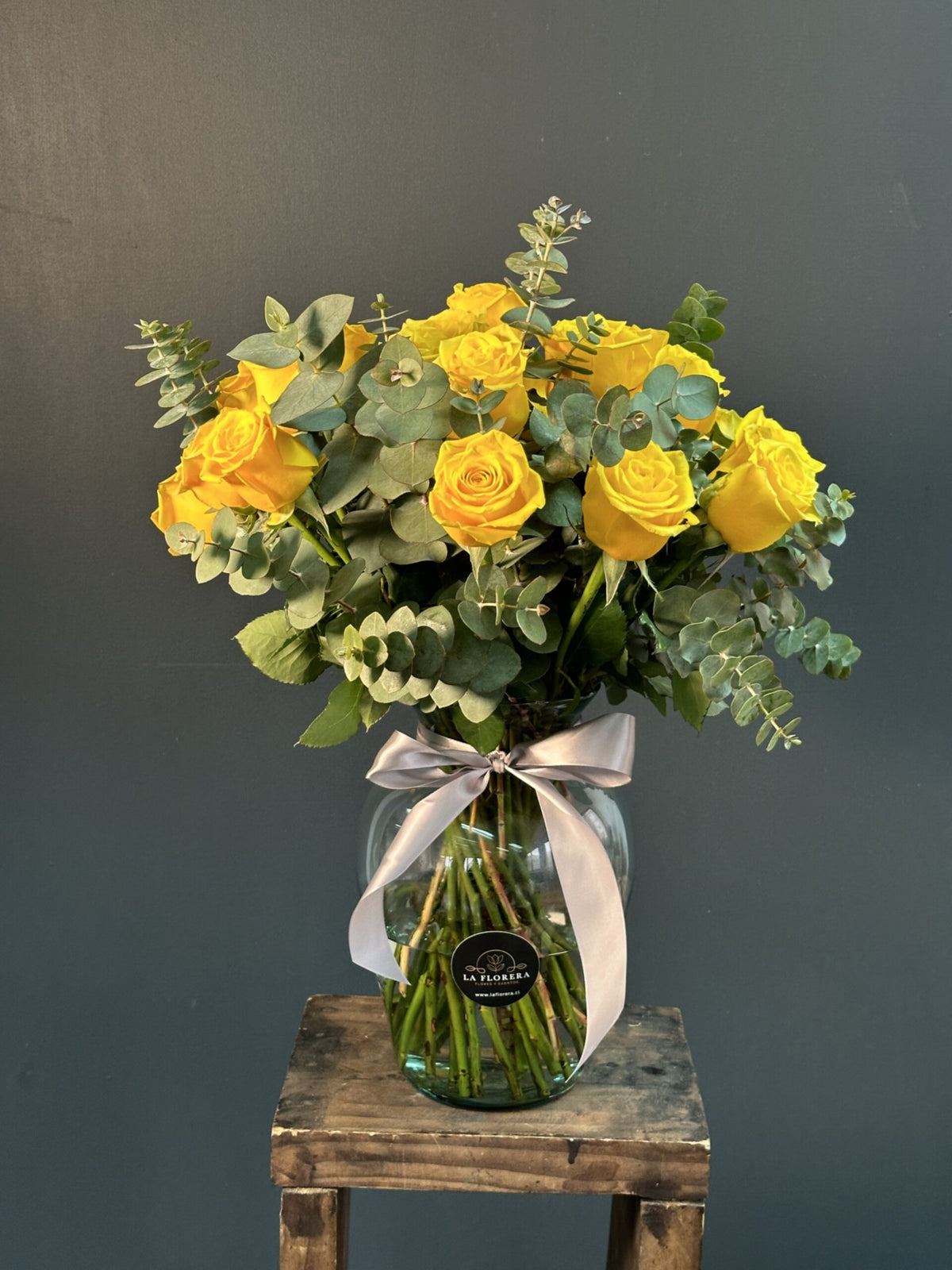 FLORERO 24 ROSAS AMARILLAS Y EUCALIPTO