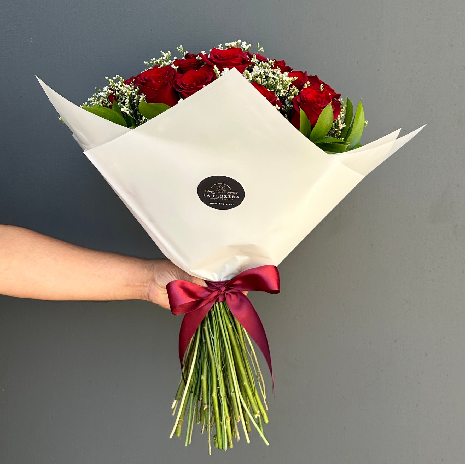 Ramo de 24 rosas rojas y limonium