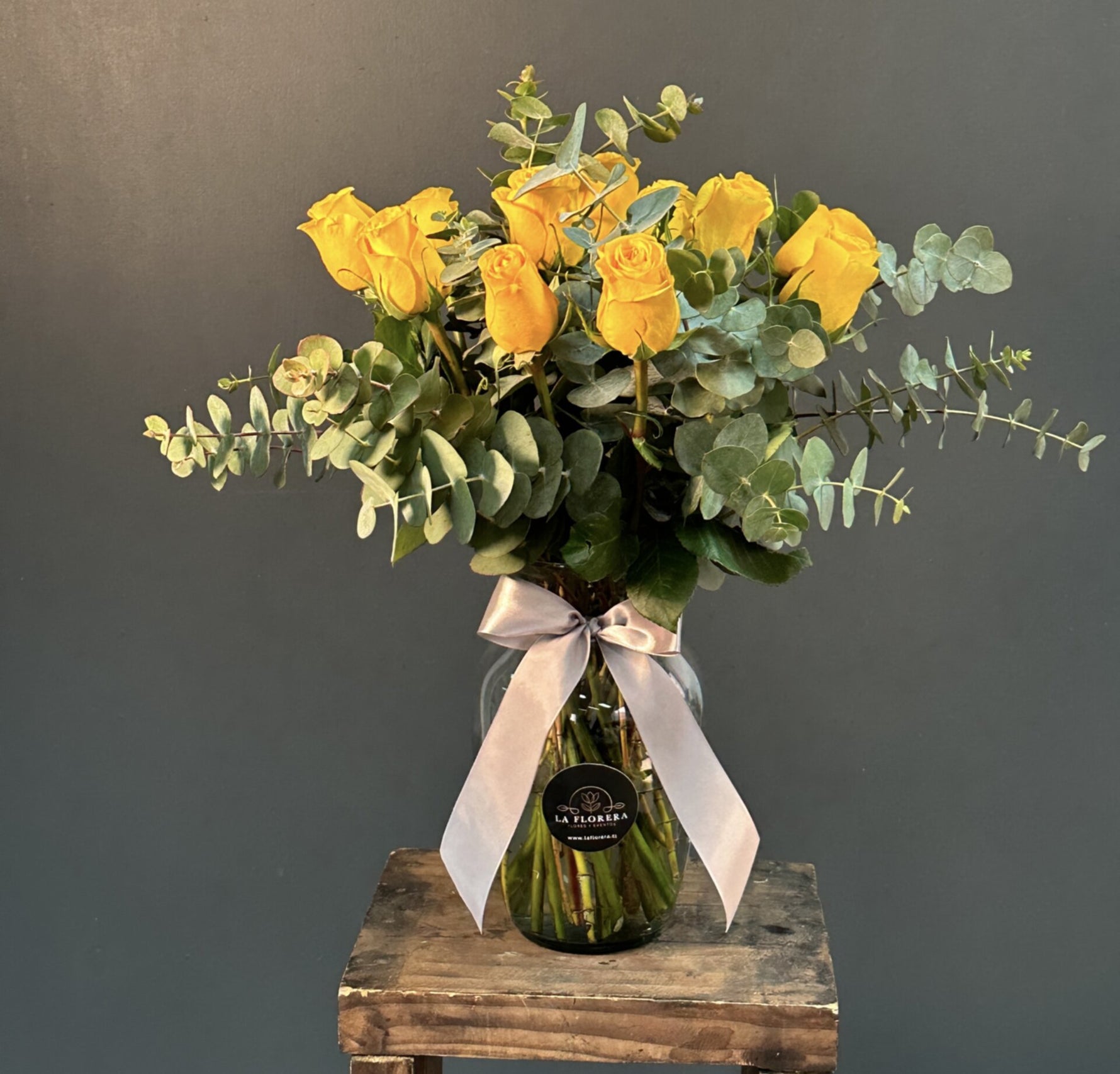 FLORERO 12 ROSAS AMARILLAS Y EUCALIPTO