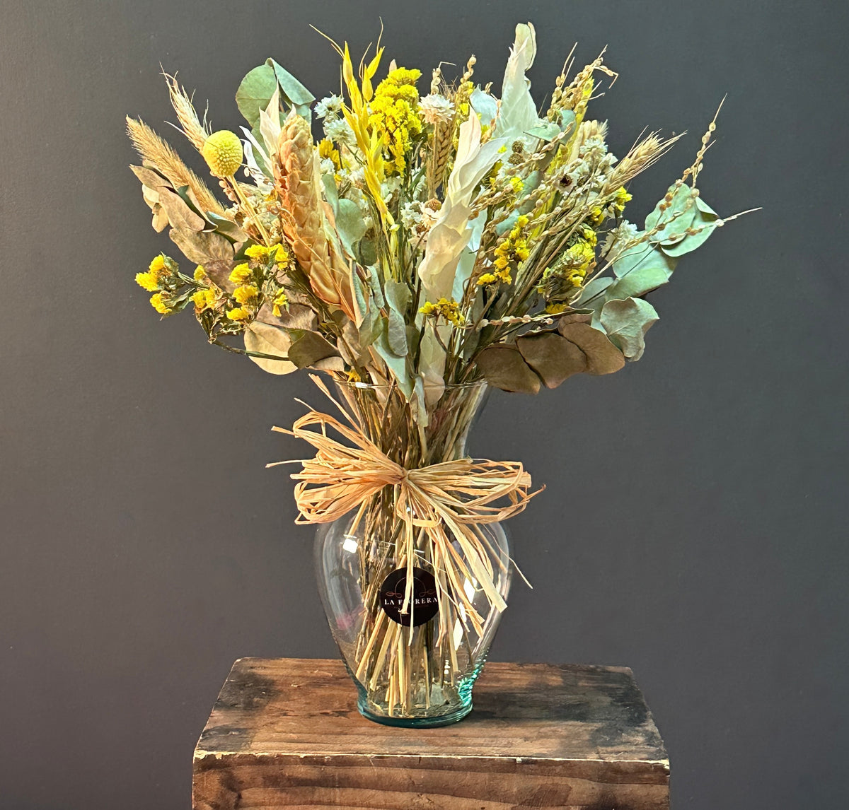 - Materiales de primera calidad: flores secas y preservadas, follajes, base decorativa y todos los insumos necesarios.