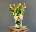 Precio unitario / porFlorero con 10 tulipanes rojos y follaje verde
