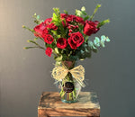 Florero de vidrio con flores rojas y follajes verdes